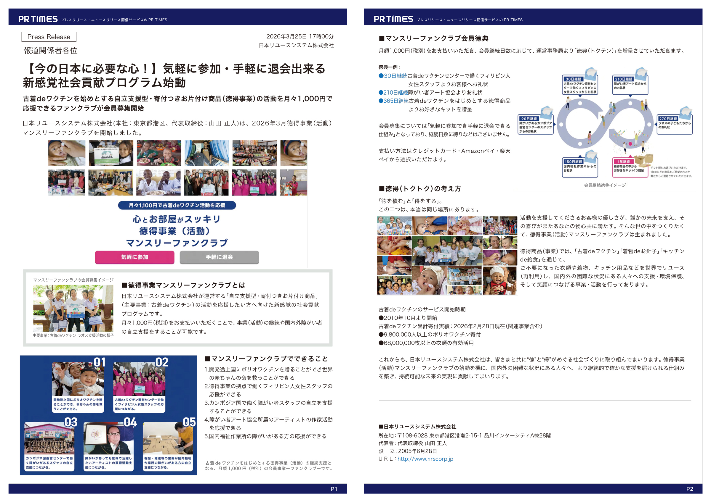 【徳得事業】マンスリーファンクラブについてプレスリリースを配信いたしました。 2026 3/25 プレスリリース March 25, 2026 【徳得事業】マンスリーファンクラブについてプレスリリースを配信いたしました。 マンスリーファンクラブ参加はこちら プレスリリース よかったらシェアしてね! URLをコピーしました! URLをコピーしました!
